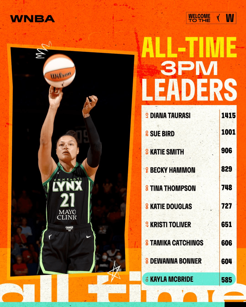 Kayla McBride est entrée hier, dans le top 10 all-time au nombre de paniers à 3 points inscrits en carrière. Un bel accomplissement pour la sniper de Minnesota.