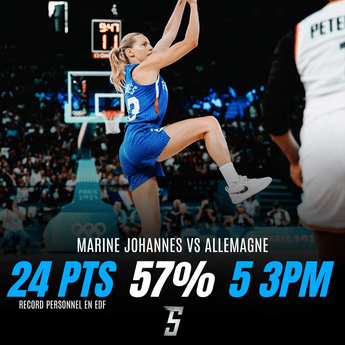 Marine Johannes, comme un symbole, bat son record personnel de points en Équipe de France avec 24 points à 8/14 au tir, dont 5/10 à 3 points.